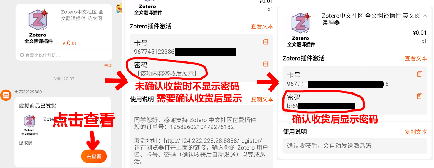 需要在淘宝上确认收货后,才可查看卡号和密码。按下图的操作